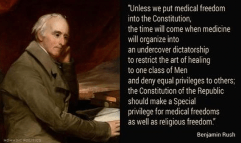 Several days ago I came across this quote and couldn’t help but to think how timely it is especially given that the Biden regime will be declaring the pandemic over-well on May 11th, for now. Benjamin Rush (1746-1813) was a contemporary of Thomas Jefferson, John Adams, Thomas Paine and Benjamin Franklin and a signer of the Declaration of Independence. He was a physician, educator, abolitionist and prolific writer.