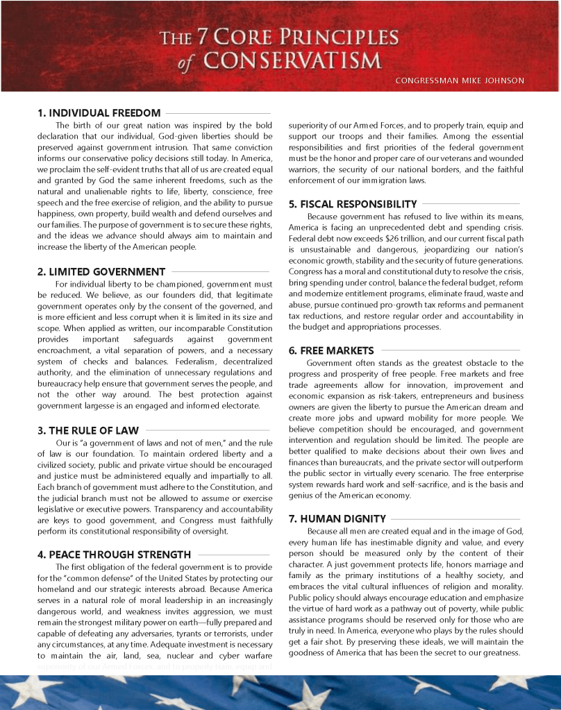 In 2018, Congressman Johnson (now Speaker of the House) drafted this short summary of the central beliefs of American conservatives to help anchor the work of the Republican Study Committee in the timeless principles that made our nation the freest, strongest, and most prosperous in human history. Since that time, many other conservative organizations and lawmaking bodies nationwide have adopted this list as their own.